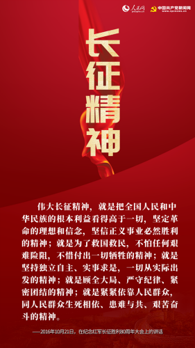 “不(bu)論我們的(de)事(shi)業髮(fa)展到(dao)哪一步(bu),不(bu)論我(wo)們取(qu)得了多大(da)成就(jiu),我(wo)們都(dou)要(yao)大力(li)弘颺偉(wei)大長徴精神,在新(xin)的(de)長(zhang)徴路(lu)上繼續奮(fen)勇(yong)前(qian)進。”——習近(jin)平(ping)